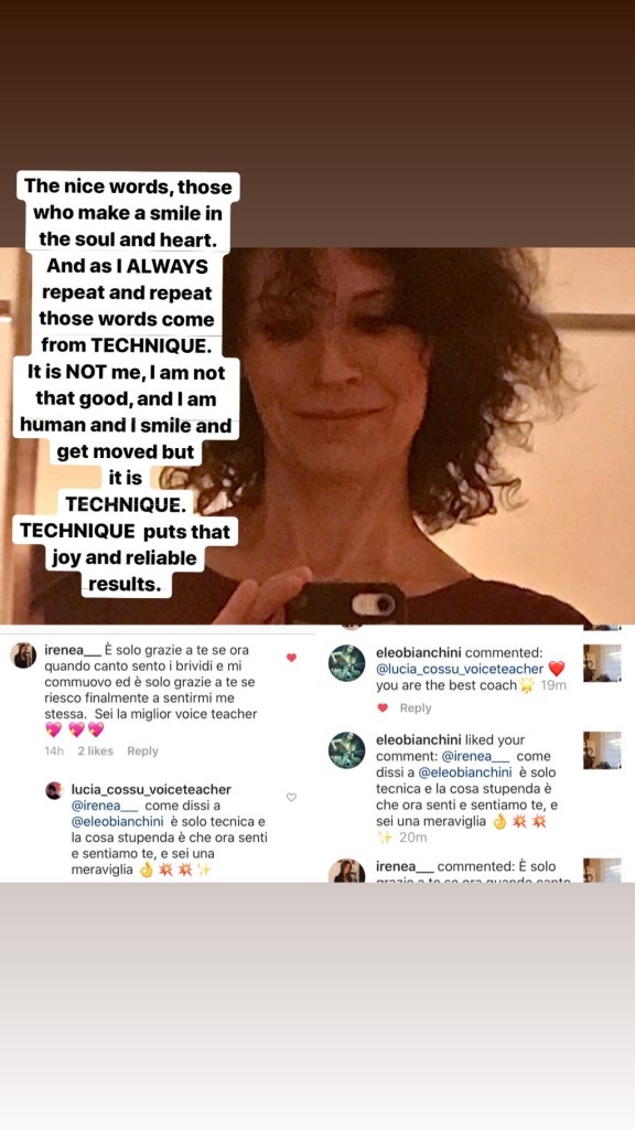 Another happy ending from struggle. She arrived to me not being able to sing without strain and breaking the sounds. Younger she was a natural voice, then some voice lessons and her voice did not improve but collapsed (that is why training of young voices must be of the finest level of knowledge for functionality and voice development, so easy to slip down fast and put dysfunctionality just for too much pretension too soon). It developed in a dysfunctional voice with struggle and breaking the sounds, impossibility of singing more than half an hour every other day. Logopedic treatments and other different voice teachers useless. She did not contact me immediately because skeptical of Skype lessons. Then we started, we made 11 months weekly lessons, a pause of one year due to her scholastic tasks and another 11 months of weekly lessons and here she is preparing the first gigs, no need of my lessons now. She has now to develop her style and sound, now it is her choice and path, but not anymore struggle for unknown reasons. Very very happy.