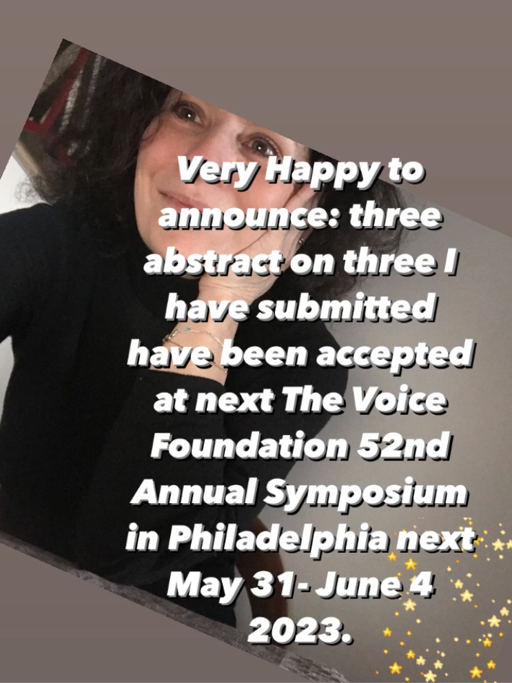 Very Happy to announce: three abstracts on three I have submitted have been accepted at next The Voice Foundation 52nd Annual Symposium in Philadelphia May 31- June 4 2023 https://voicefoundation.org/symp/