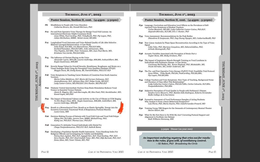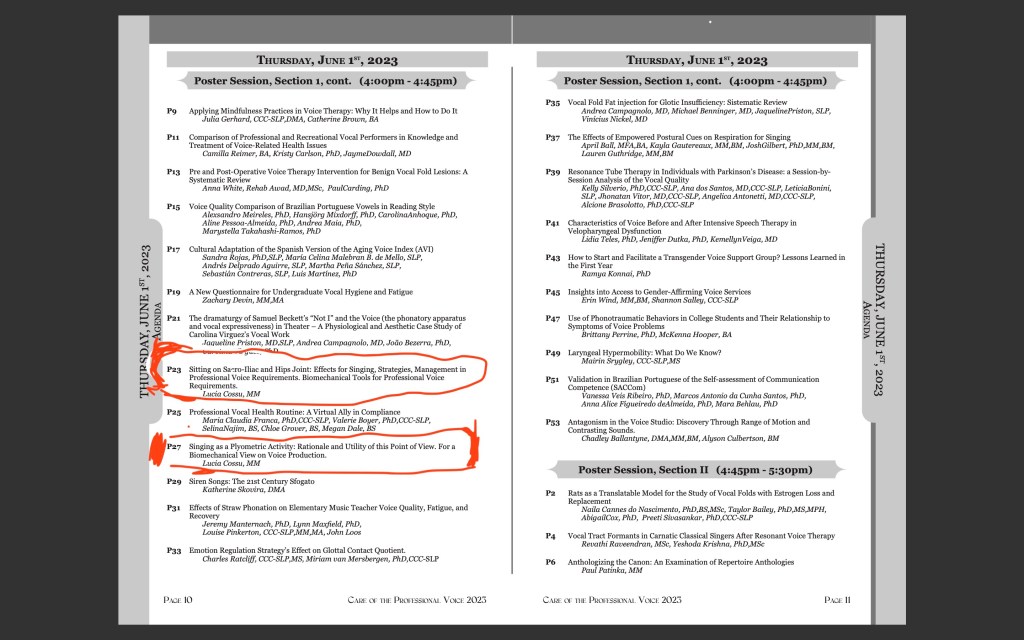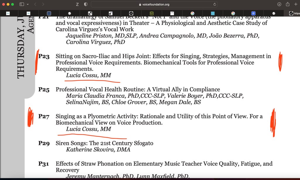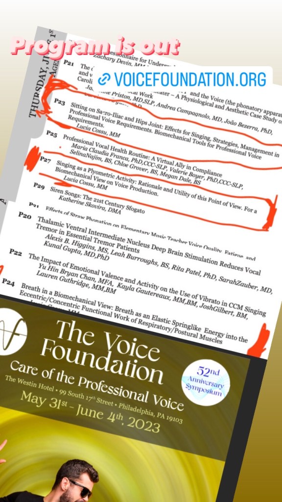 23, 24 & 27: my three Posters for Voice Foundation Symposium, program is out. https://voicefoundation.org/wp-content/uploads/2023/03/2023-SYMP-Program.pdf And here the specifics of my view in integrating directly biomechanics into voice production/training for this Symposium. Come say hello or come to the presentation Thursday 1st of June 2023.