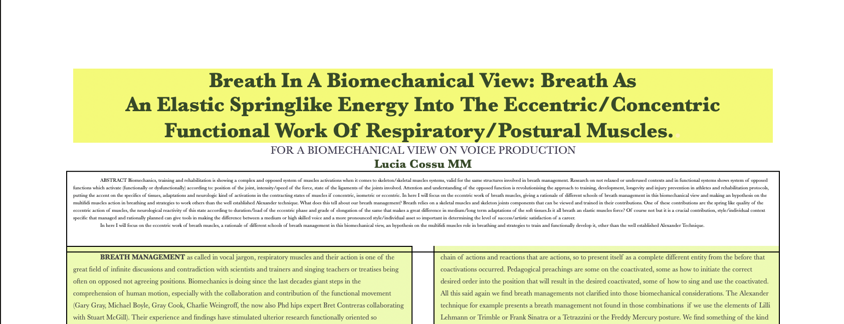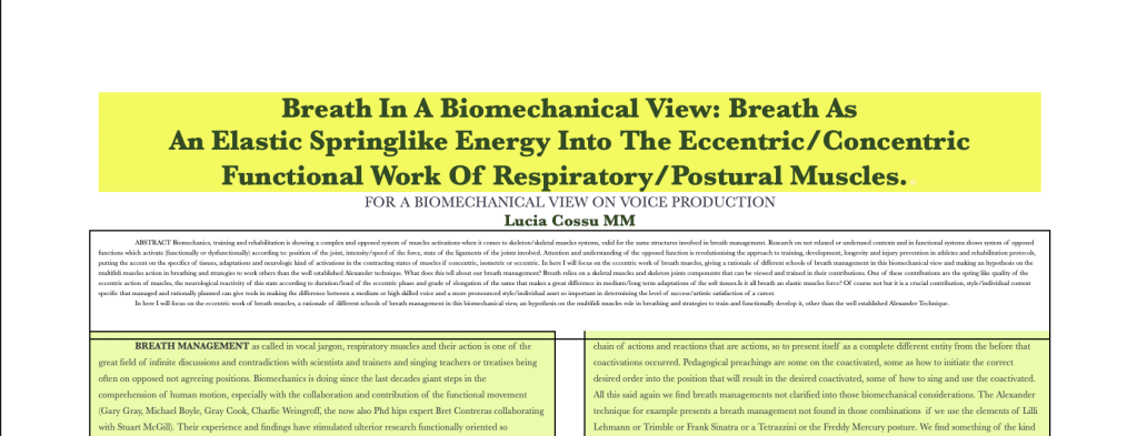 ABSTRACT Biomechanics, training and rehabilitation is showing a complex and opposed system of muscles activations when it comes to skeleton/skeletal muscles systems, valid for the same structures involved in breath management. Research on not relaxed or underused contexts and in functional systems shows system of opposed functions which activate (functionally or dysfunctionally) according to: position of the joint, intensity/speed of the force, state of the ligaments of the joints involved. Attention and understanding of the opposed function is revolutionising the approach to training, development, longevity and injury prevention in athletes and rehabilitation protocols, putting the accent on the specifics of tissues, adaptations and neurologic kind of activations in the contracting states of muscles if concentric, isometric or eccentric. In here I will focus on the eccentric work of breath muscles, giving a rationale of different schools of breath management in this biomechanical view and making an hypothesis on the multifidi muscles action in breathing and strategies to work others than the well established Alexander technique. What does this tell about our breath management? Breath relies on a skeletal muscles and skeleton joints components that can be viewed and trained in their contributions. One of these contributions are the spring like quality of the eccentric action of muscles, the neurological reactivity of this state according to duration/load of the eccentric phase and grade of elongation of the same that makes a great difference in medium/long term adaptations of the soft tissues.Is it all breath an elastic muscles force? Of course not but it is a crucial contribution, style/individual context specific that managed and rationally planned can give tools in making the difference between a medium or high skilled voice and a more pronounced style/individual asset so important in determining the level of success/artistic satisfaction of a career.