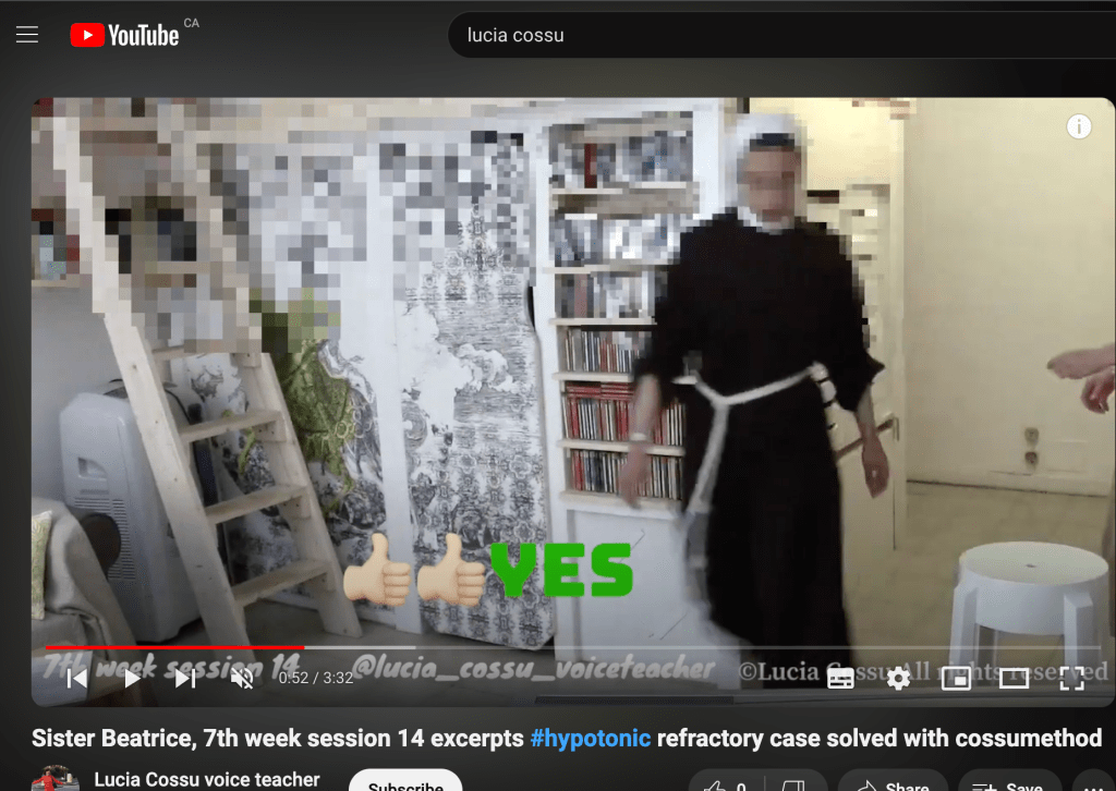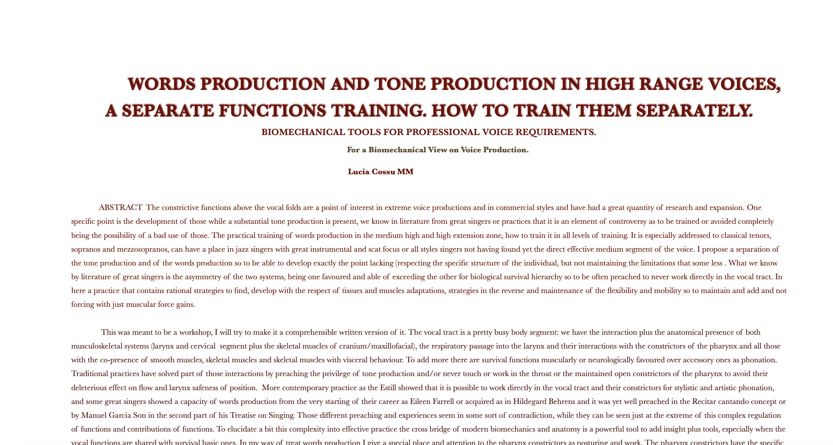 In the below link those tools in artistic training. Unilateral training and word production pharynx constrictors training in artistic opera voice. The not clear point in the field now is how adaptations occur, in what timing and way. As all musculoskeletal system trainings you find first the real state of the system and then the gains by the training: in vocal terms you find all the not trained parts appearing at the same time of some better qualities, then in some months – at least six and usually nine- you definitely have the evolution of all the system in its possibilities of dynamics, extension, colour, stability, easiness, quality of the tone, expressive capacity, feeling of true voice to the singer or individual. The complete adaptations take longer and we talk about 2-3 years. It is not a long time for a singers’s life and career, and it is in line with all the finding in the field of musculoskeletal disciplines/treatments. I respect the singer desire to not present with the sound she had before our lessons, but you will hear from the six months mark and the successive evolution.