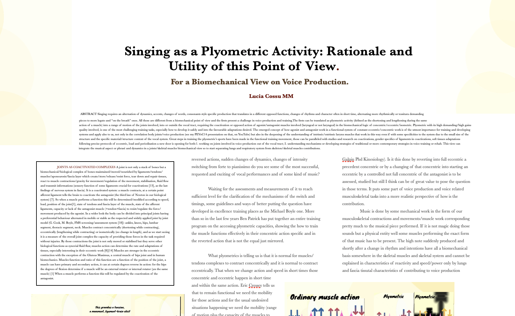 The fourth is on a very stringent singers question: breath. Breath has been hypothesised as isometric in itself – and on isometric concept I presented a isometric holding biomechanical contributions at PEVoC15 in Basic Science Biomechanics to nuance more precisely- you know the devil is in the details, also in biology. Here the reasons and useful of a broader view on forces acting into actual singing and singing management, so to have more tools and more appropriate for styles and voices. Always biomechanically and biologically based, as our instrument is.
