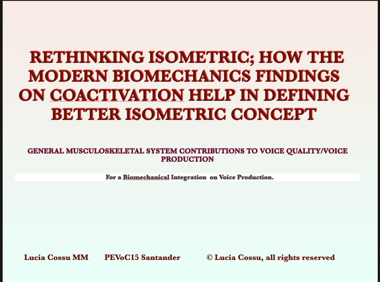 The eight is on a concept central to voice and voice production: the isometric. I presented it at PEVoC15 2024 in Basic Science Biomechanics session. It is in its true contributions more nuanced and this nuancing are at the basis of tools and solutions that have been one of my unprecedented results reasons since 15 years in both pathological or artistic voices, both in spontaneous and artistic phonation.