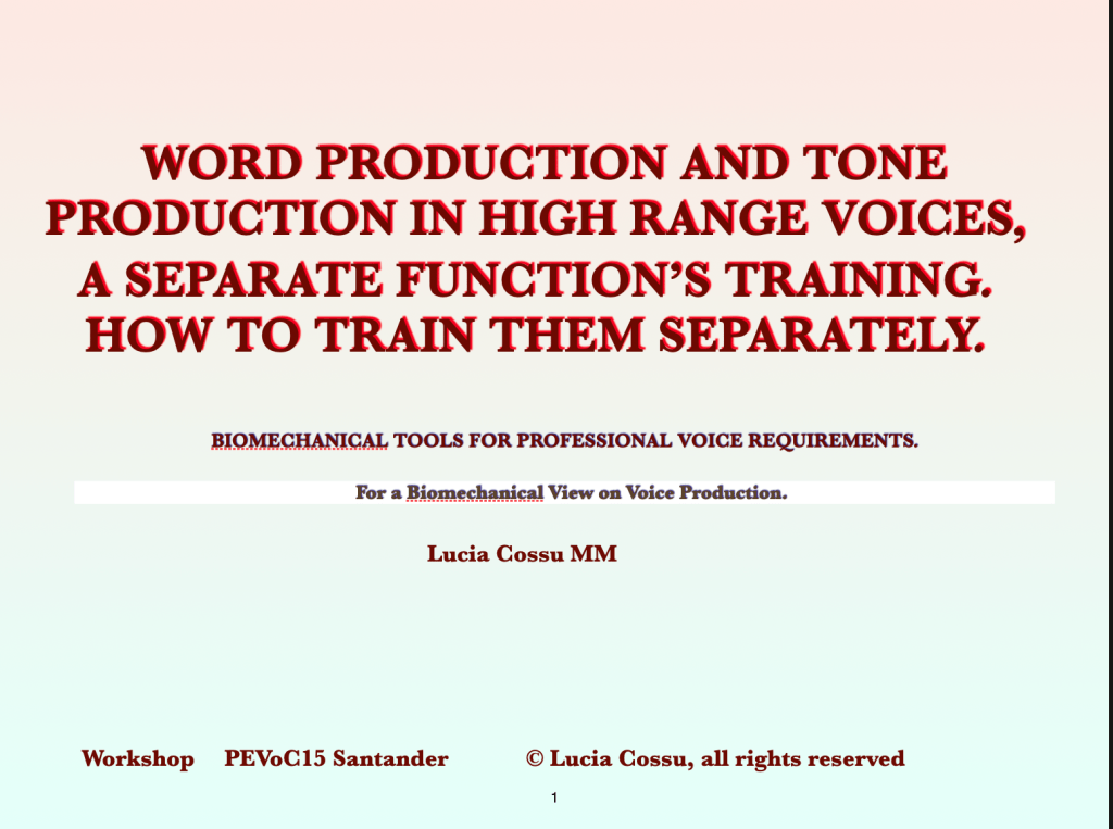 The third is on something that musicians know in playing their instrument and that for voice was thought in a less obvious way from the restrictive idea that voice depends only on air and air flow pressure. In high level historical practices some body – musculoskeletal system- precise actions were erroneously called breath while they act into all the voice system so to be perceived as breath, but to implement them the just respiratory system has shown to be absolutely unable to attain those sophisticated high efficient results. This is because they do not originate from the respiratory system and have very music related stringent logics, so to become very intuitive. The workshop can be in the practical version or in the more theoretical one as I presented as a Poster at The Voice Foundation 52nd Symposium – 2023 Philadelphia