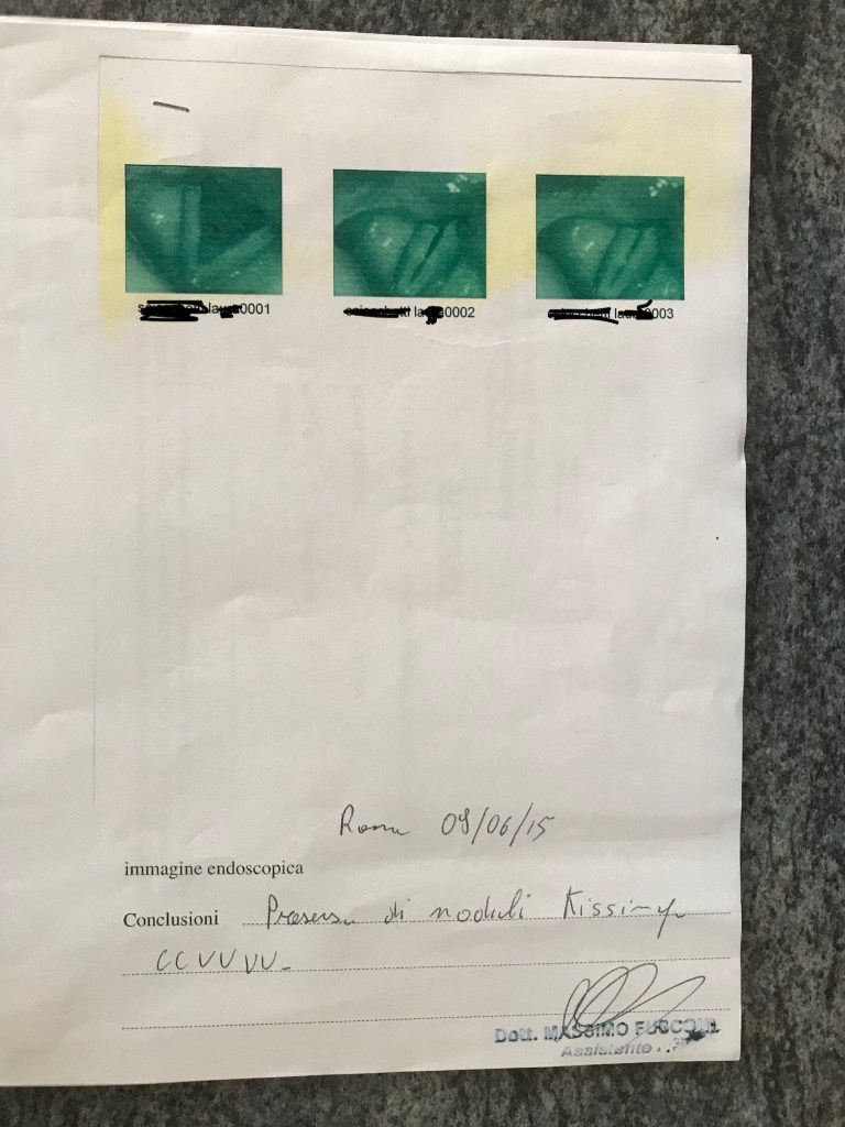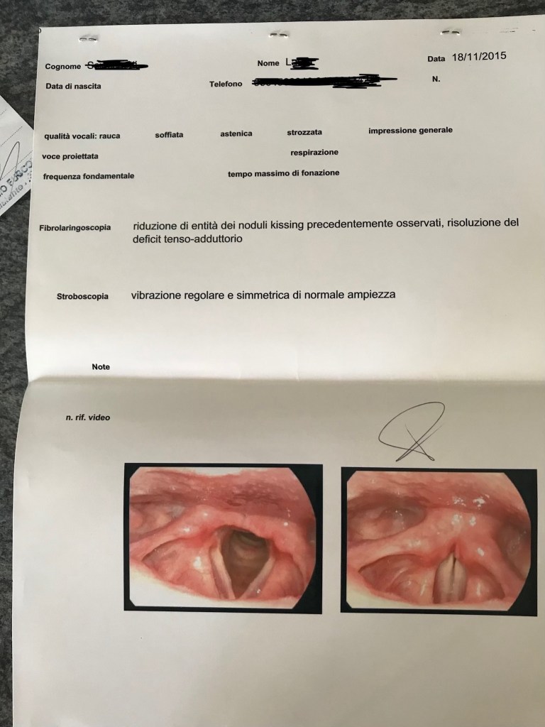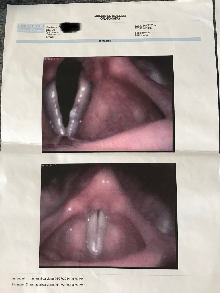 The first is the one of the video above. Nine weeks to change the first photo to the second with professional singer who had excellent training and could not develop the voice without straining it. From nodules, a precontact since many years, aematoma and a whiplash injury to good vocal chords and sound finally.