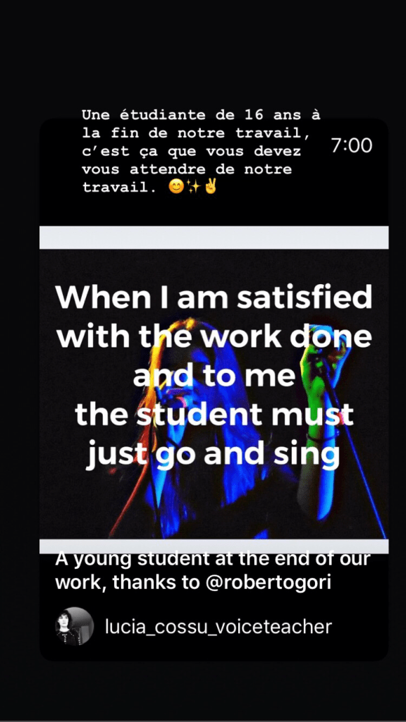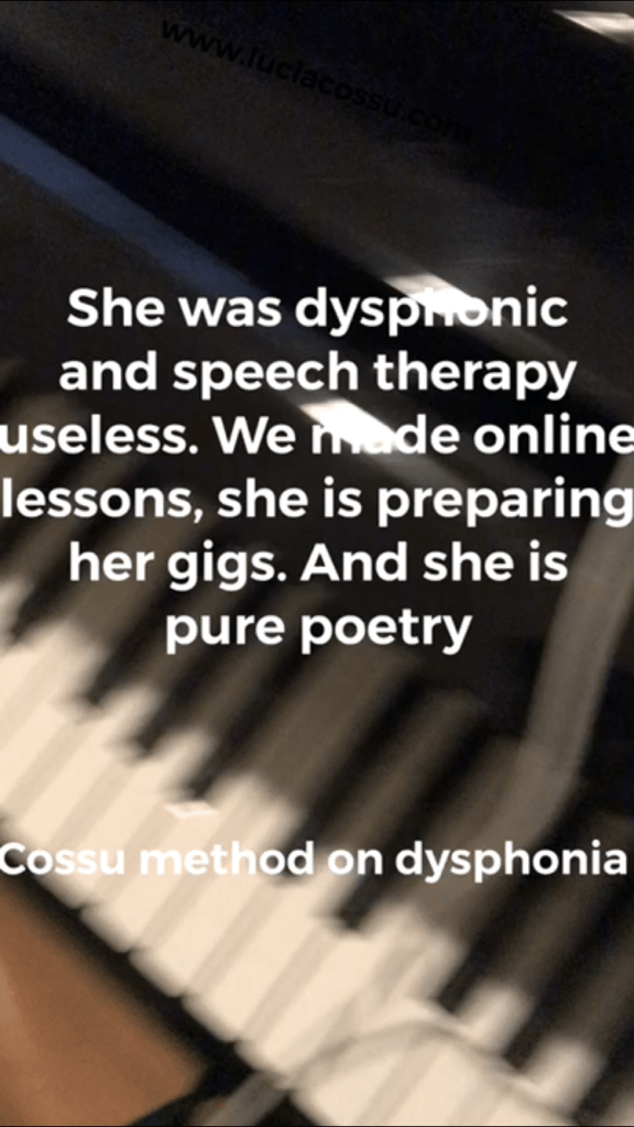 Je fais référence à la technique italienne du Belcanto selon laquelle j’ai été entrainée et avec laquelle j’ai fait ma carrière (très belle carrière mais courte, interrompue par une septicemie) et à la méthode cossu qui est une façon de travailler sur la structure de la voix, pour se comprendre sur ce que vous pensez être votre nature et qui donne le don de la voix ou qui le nie, et bien non c’est une structure sur laquelle on peut maintenant travailler. Si vous clickez sur les photo vous allez en voir trois exemples, sur une chanteuse qui ne pouvez pas developper mais abimer sa voix (elle a eu excellent training mais il était impossible), la déuxième une jeune dysphonique (les sons se cassaient tous et elle restait sans voix après une demie heure de chant) et elle aussi avec des cours inutiles et la logopédie sans effets sur elle, un petit enfant que la logopédie n’arrivait pas aider et il est un peux plus heureux maintenant (et moi aussi que #cossumethod ai pu l’aider à parler).