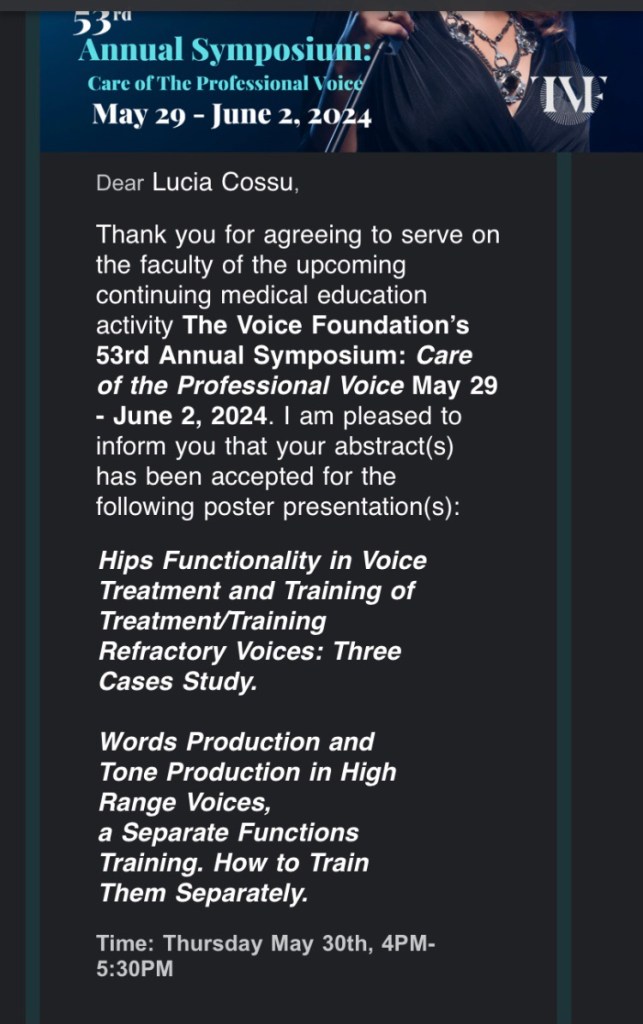 Her innovative perspective has been recently presented at the prestigious Pan-European Voice Conference PEVoC14 2022 in one paper and two workshops and three Posters at The Voice Foundation 52nd Annual Symposium May 31- June 4 2023 in Philadelphia, she will be again at both in 2024 with two oral presentations, two workshops and two more Posters. She calls this perspective the (R)Evolution of voice model, or if you prefer cossumethod in the actual practice.